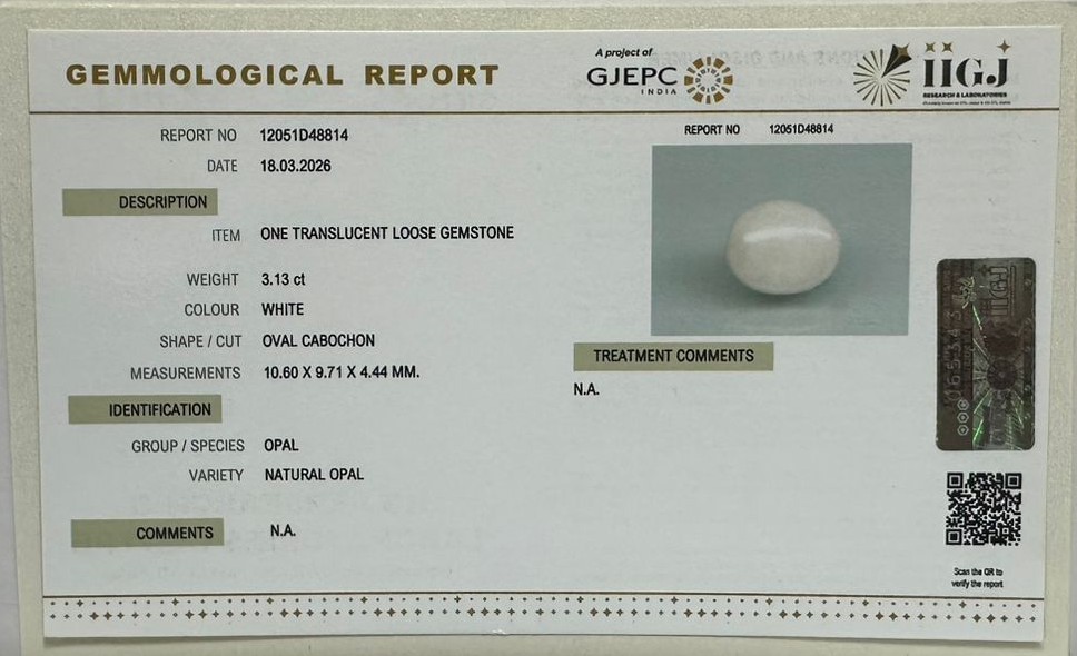 Beautiful 3.13 Cts Natural Opal (AAA+-Mines) sva 3+ Ratti OPAL. Free Horoscope & Free Pundit Ji Astrological Advise / Consultation. Original Natural Lab certified gems by IGI GTL / Birth stones / Large Gem Selection of shree shubh Rashi Ratan Vedic dhan at Gem Mines. May Bhagwan Brahma, Vishnu, Shiv & Universe bless you.