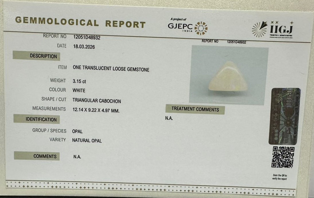 Beautiful 3.15 Cts Natural Opal (Top-Mines) sva 3+ Ratti OPAL. Free Horoscope & Free Pundit Ji Astrological Advise / Consultation. Original Natural Lab certified gems by IGI GTL / Birth stones / Large Gem Selection of shree shubh Rashi Ratan Vedic dhan at Gem Mines. May Bhagwan Brahma, Vishnu, Shiv & Universe bless you.