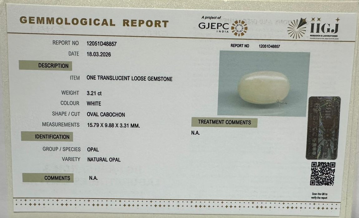 Beautiful 3.21 Cts Natural Opal (Very Good-Mines) sva 3+ Ratti OPAL. Free Horoscope & Free Pundit Ji Astrological Advise / Consultation. Original Natural Lab certified gems by IGI GTL / Birth stones / Large Gem Selection of shree shubh Rashi Ratan Vedic dhan at Gem Mines. May Bhagwan Brahma, Vishnu, Shiv & Universe bless you.