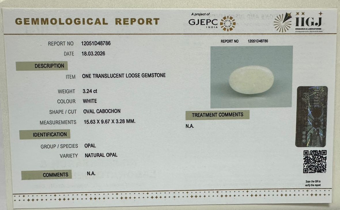 Beautiful 3.24 Cts Natural Opal (AAA+-Mines) sva 3+ Ratti OPAL. Free Horoscope & Free Pundit Ji Astrological Advise / Consultation. Original Natural Lab certified gems by IGI GTL / Birth stones / Large Gem Selection of shree shubh Rashi Ratan Vedic dhan at Gem Mines. May Bhagwan Brahma, Vishnu, Shiv & Universe bless you.