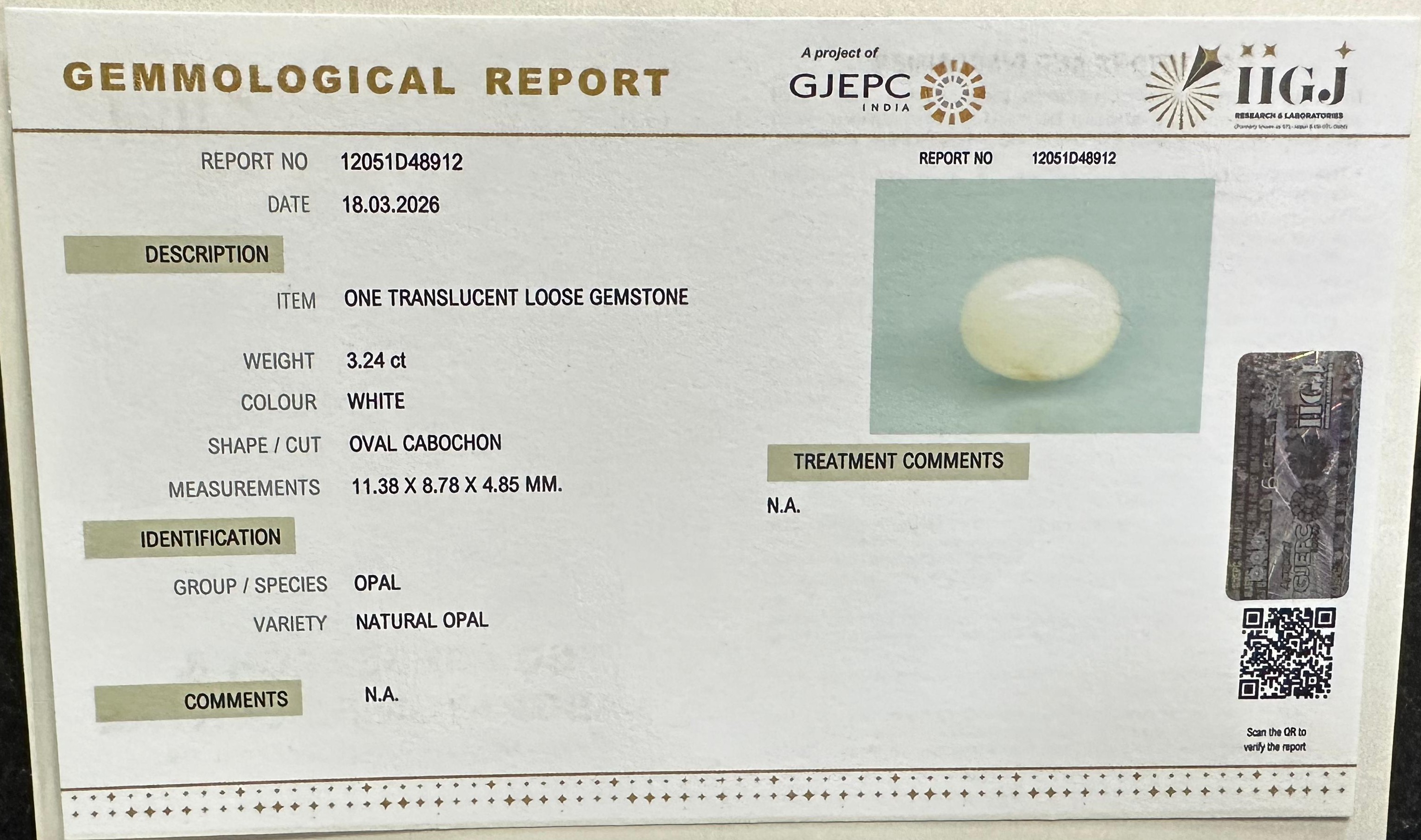 Beautiful 3.24 Cts Natural Opal (AAA+-Mines) sva 3+ Ratti OPAL. Free Horoscope & Free Pundit Ji Astrological Advise / Consultation. Original Natural Lab certified gems by IGI GTL / Birth stones / Large Gem Selection of shree shubh Rashi Ratan Vedic dhan at Gem Mines. May Bhagwan Brahma, Vishnu, Shiv & Universe bless you.
