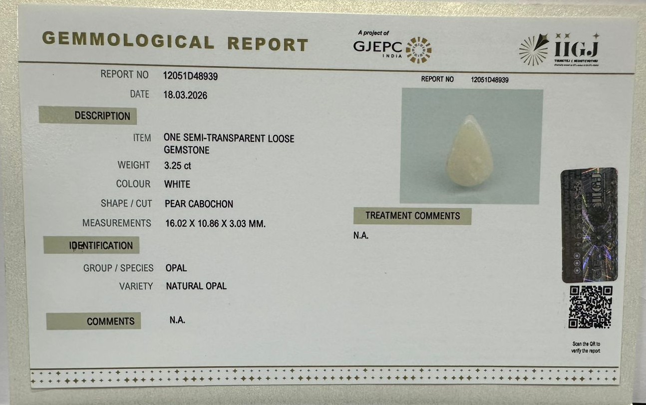 Beautiful 3.25 Cts Natural Opal (Top-Mines) sva 3+ Ratti OPAL. Free Horoscope & Free Pundit Ji Astrological Advise / Consultation. Original Natural Lab certified gems by IGI GTL / Birth stones / Large Gem Selection of shree shubh Rashi Ratan Vedic dhan at Gem Mines. May Bhagwan Brahma, Vishnu, Shiv & Universe bless you.