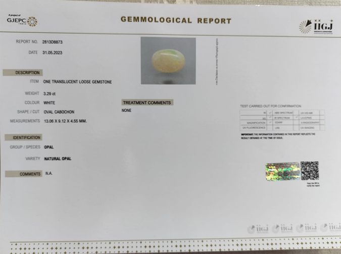 Beautiful 3.29 Ct. Natural Opal (Top++-Mines) sva 3+ Ratti Dudhiya Pathar. Free Horoscope & Free Pundit Ji Astrological Advise / Consultation. Original Natural Lab certified gems by IGI GTL / Birth stones / Large Gem Selection of shree shubh Rashi Ratan Vedic dhan at Gem Mines. May Bhagwan Brahma, Vishnu, Shiv & Universe bless you.