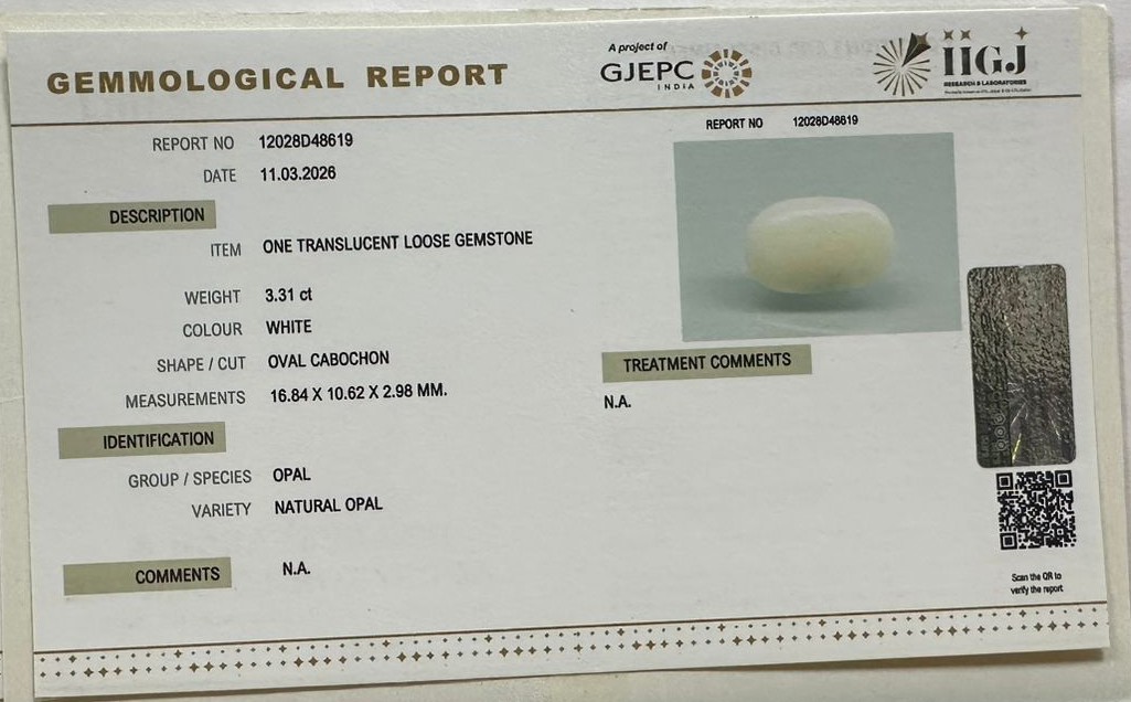 Beautiful 3.31 Cts Natural Opal (Top-Mines) sva 3+ Ratti OPAL. Free Horoscope & Free Pundit Ji Astrological Advise / Consultation. Original Natural Lab certified gems by IGI GTL / Birth stones / Large Gem Selection of shree shubh Rashi Ratan Vedic dhan at Gem Mines. May Bhagwan Brahma, Vishnu, Shiv & Universe bless you.