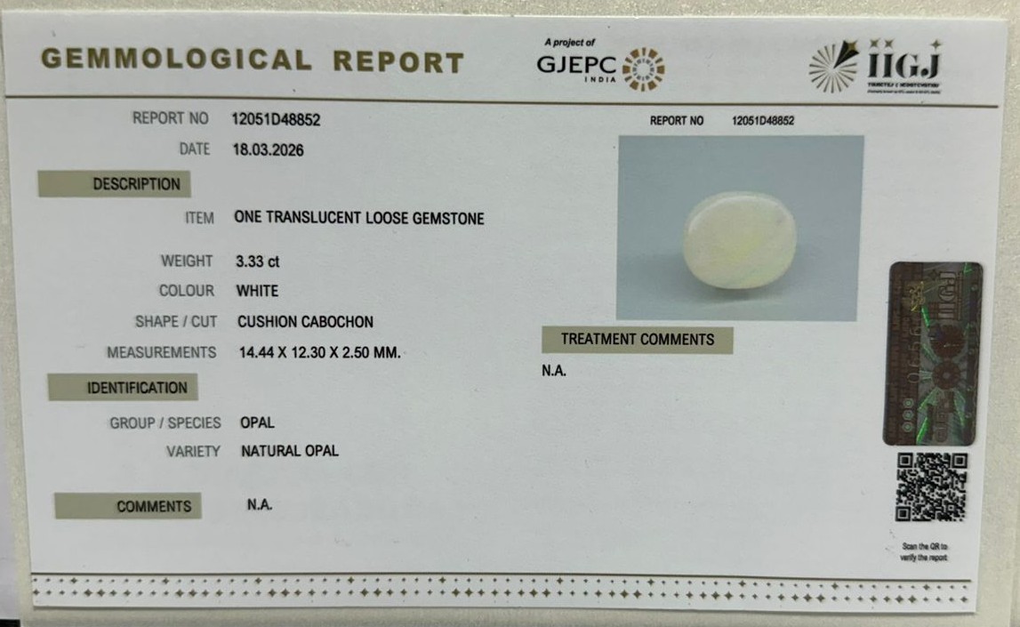 Beautiful 3.33 Cts Natural Opal (Top-Mines) sva 3+ Ratti OPAL. Free Horoscope & Free Pundit Ji Astrological Advise / Consultation. Original Natural Lab certified gems by IGI GTL / Birth stones / Large Gem Selection of shree shubh Rashi Ratan Vedic dhan at Gem Mines. May Bhagwan Brahma, Vishnu, Shiv & Universe bless you.