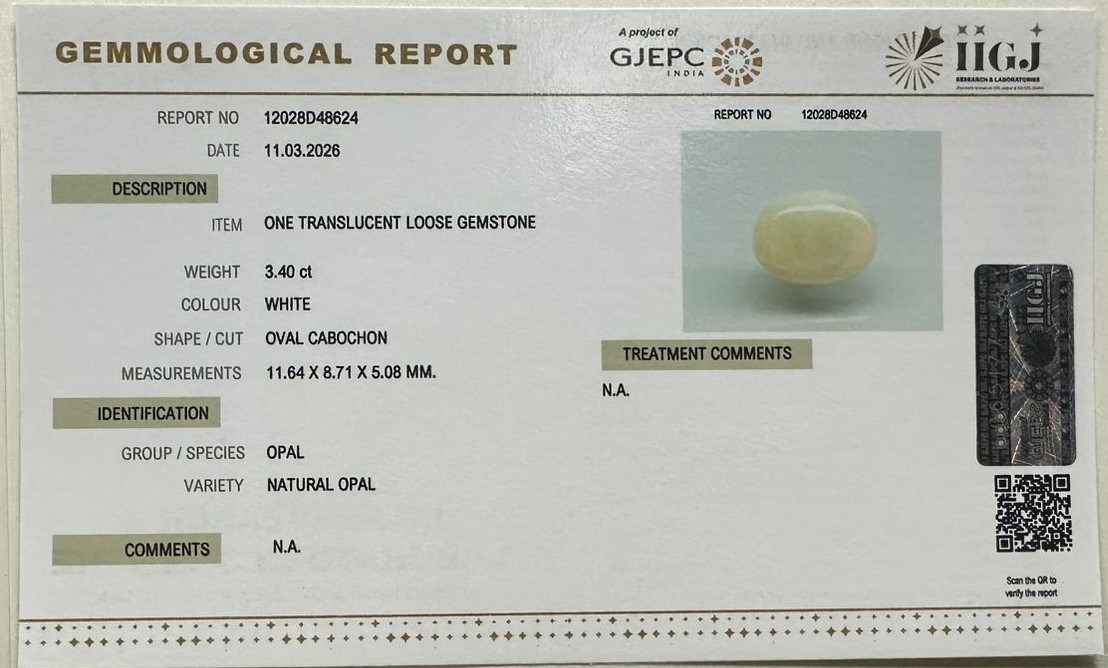 Beautiful 3.4 Cts Natural Opal (Top-Mines) sva 3+ Ratti OPAL. Free Horoscope & Free Pundit Ji Astrological Advise / Consultation. Original Natural Lab certified gems by IGI GTL / Birth stones / Large Gem Selection of shree shubh Rashi Ratan Vedic dhan at Gem Mines. May Bhagwan Brahma, Vishnu, Shiv & Universe bless you.
