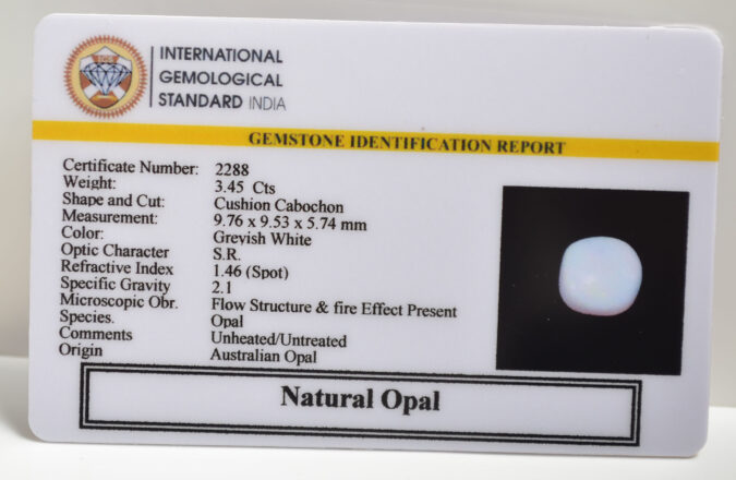 Beautiful 3.45 Cts Natural Opal (Top-Mines) sva 3+ Ratti OPAL. Free Horoscope & Free Pundit Ji Astrological Advise / Consultation. Original Natural Lab certified gems by IGI GTL / Birth stones / Large Gem Selection of shree shubh Rashi Ratan Vedic dhan at Gem Mines. May Bhagwan Brahma, Vishnu, Shiv & Universe bless you.