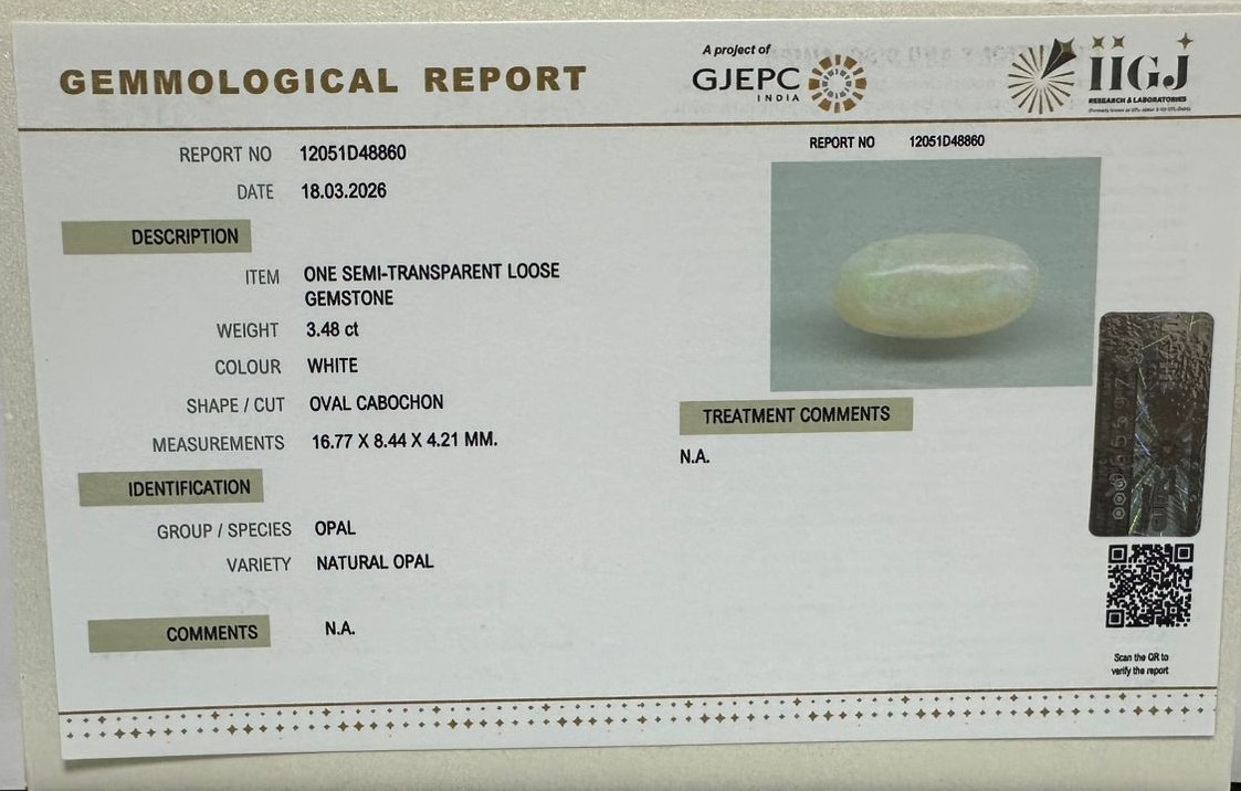 Beautiful 3.48 Cts Natural Opal (Very Good-Mines) sva 3+ Ratti OPAL. Free Horoscope & Free Pundit Ji Astrological Advise / Consultation. Original Natural Lab certified gems by IGI GTL / Birth stones / Large Gem Selection of shree shubh Rashi Ratan Vedic dhan at Gem Mines. May Bhagwan Brahma, Vishnu, Shiv & Universe bless you.