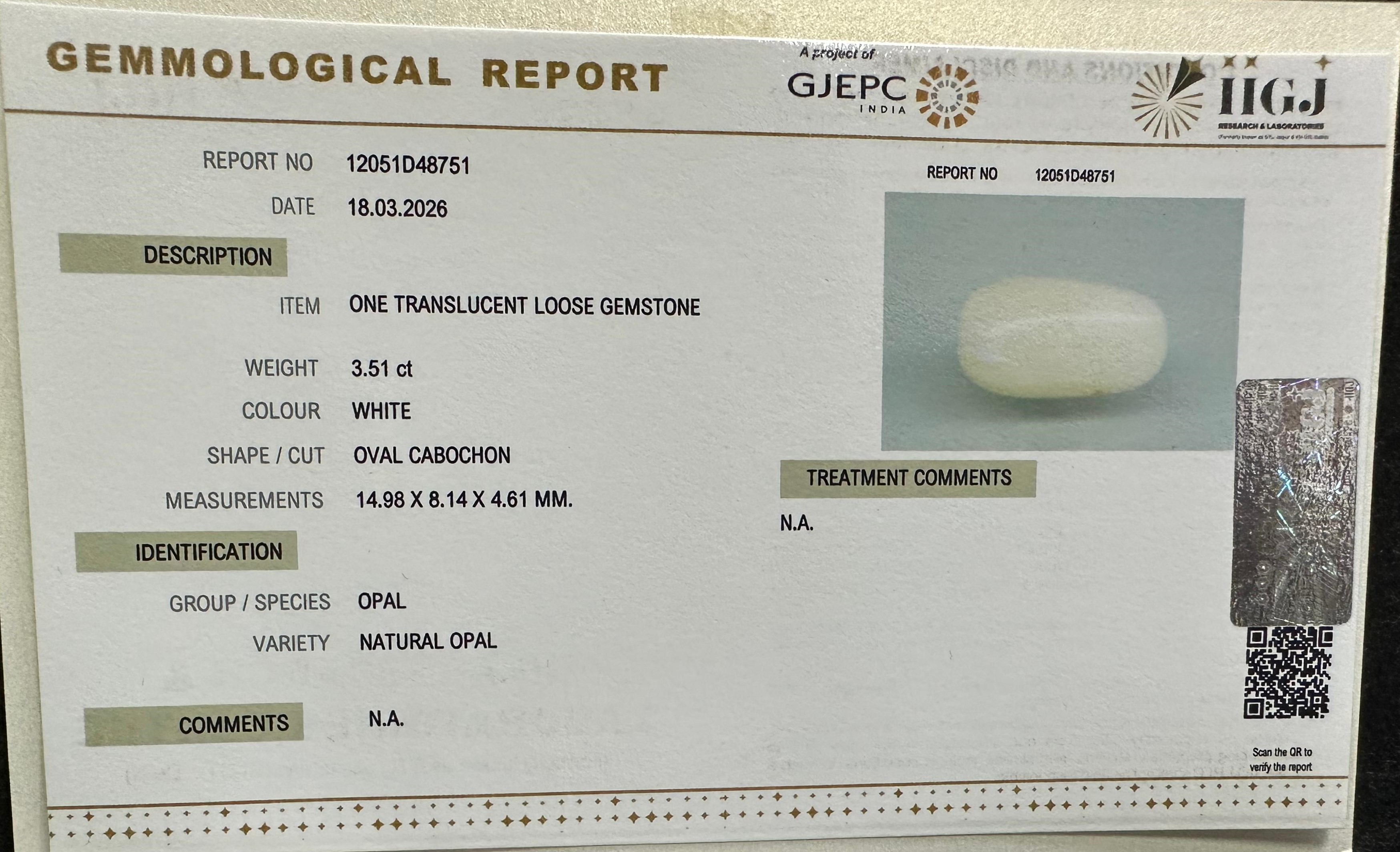 Beautiful 3.51 Cts Natural Opal (AAA+-Mines) sva 3+ Ratti OPAL. Free Horoscope & Free Pundit Ji Astrological Advise / Consultation. Original Natural Lab certified gems by IGI GTL / Birth stones / Large Gem Selection of shree shubh Rashi Ratan Vedic dhan at Gem Mines. May Bhagwan Brahma, Vishnu, Shiv & Universe bless you.