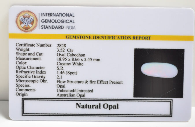 Beautiful 3.52 Cts Natural Opal (Top-Mines) sva 3+ Ratti OPAL. Free Horoscope & Free Pundit Ji Astrological Advise / Consultation. Original Natural Lab certified gems by IGI GTL / Birth stones / Large Gem Selection of shree shubh Rashi Ratan Vedic dhan at Gem Mines. May Bhagwan Brahma, Vishnu, Shiv & Universe bless you.