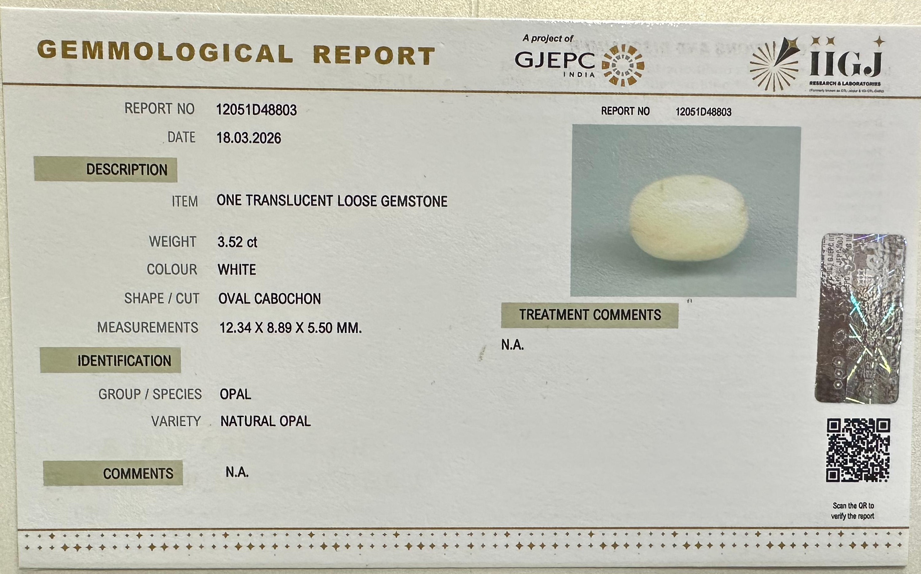 Beautiful 3.52 Cts Natural Opal (AAA+-Mines) sva 3+ Ratti OPAL. Free Horoscope & Free Pundit Ji Astrological Advise / Consultation. Original Natural Lab certified gems by IGI GTL / Birth stones / Large Gem Selection of shree shubh Rashi Ratan Vedic dhan at Gem Mines. May Bhagwan Brahma, Vishnu, Shiv & Universe bless you.