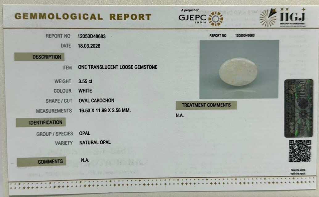 Beautiful 3.55 Cts Natural Opal (AAA-Mines) sva 3+ Ratti OPAL. Free Horoscope & Free Pundit Ji Astrological Advise / Consultation. Original Natural Lab certified gems by IGI GTL / Birth stones / Large Gem Selection of shree shubh Rashi Ratan Vedic dhan at Gem Mines. May Bhagwan Brahma, Vishnu, Shiv & Universe bless you.