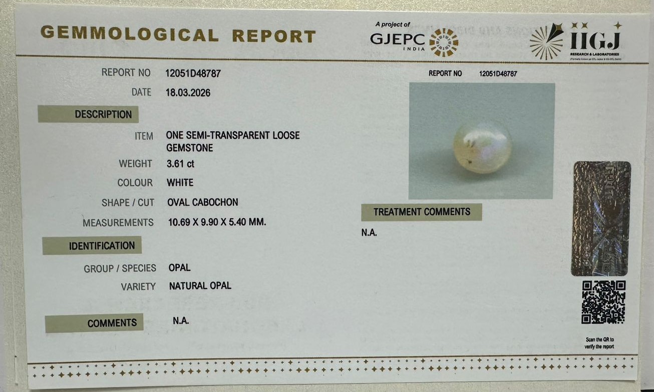 Beautiful 3.61 Cts Natural Opal (AAA+-Mines) sva 4+ Ratti OPAL. Free Horoscope & Free Pundit Ji Astrological Advise / Consultation. Original Natural Lab certified gems by IGI GTL / Birth stones / Large Gem Selection of shree shubh Rashi Ratan Vedic dhan at Gem Mines. May Bhagwan Brahma, Vishnu, Shiv & Universe bless you.