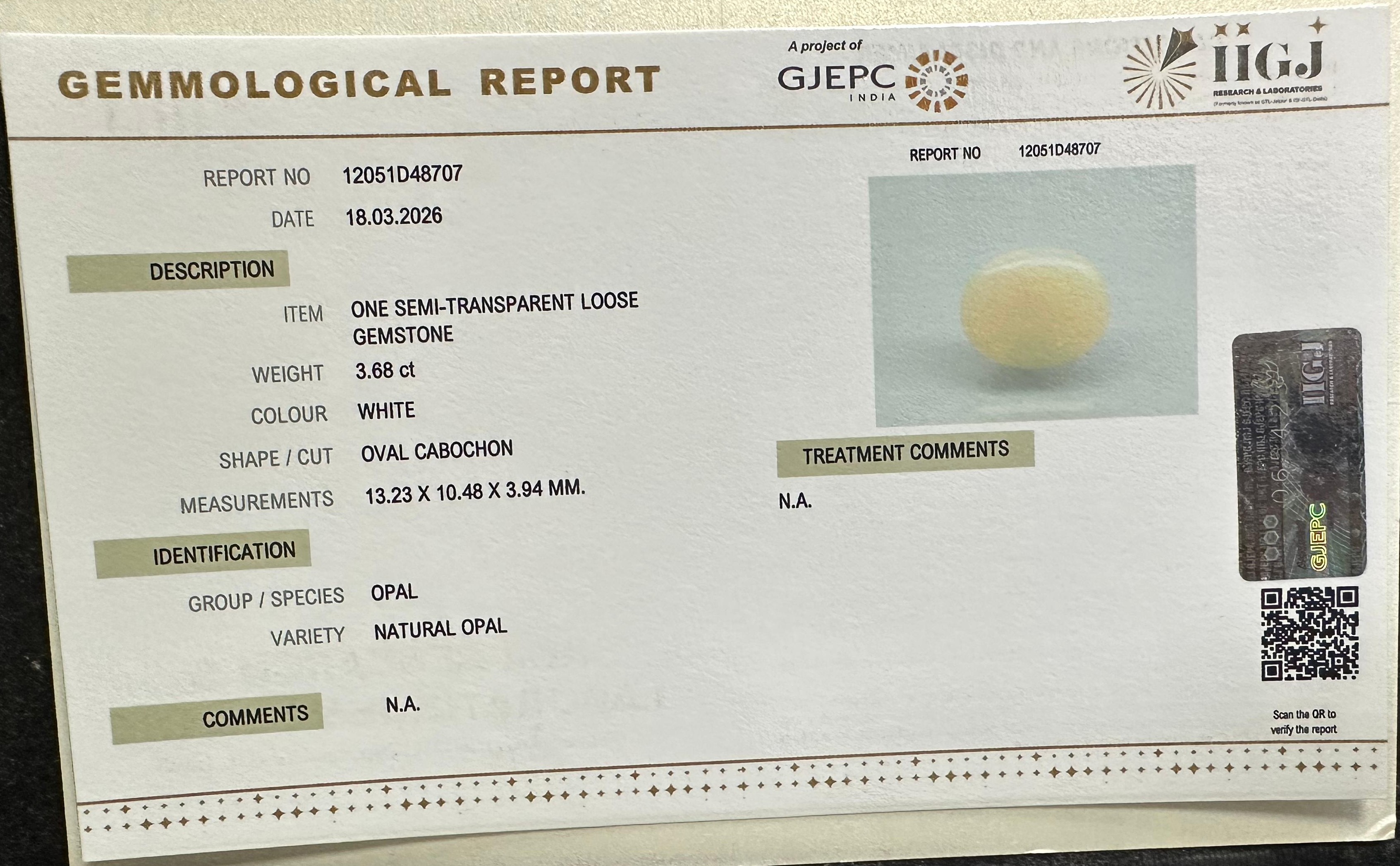 Beautiful 3.68 Cts Natural Opal (AAA+-Mines) sva 4+ Ratti OPAL. Free Horoscope & Free Pundit Ji Astrological Advise / Consultation. Original Natural Lab certified gems by IGI GTL / Birth stones / Large Gem Selection of shree shubh Rashi Ratan Vedic dhan at Gem Mines. May Bhagwan Brahma, Vishnu, Shiv & Universe bless you.