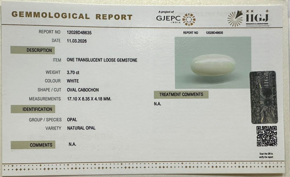 Beautiful 3.7 Cts Natural Opal (Top-Mines) sva 4+ Ratti OPAL. Free Horoscope & Free Pundit Ji Astrological Advise / Consultation. Original Natural Lab certified gems by IGI GTL / Birth stones / Large Gem Selection of shree shubh Rashi Ratan Vedic dhan at Gem Mines. May Bhagwan Brahma, Vishnu, Shiv & Universe bless you.