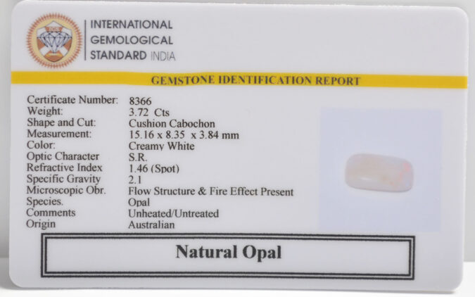 Beautiful 3.72 Cts Natural Opal (AAA-Mines) sva 4+ Ratti OPAL. Free Horoscope & Free Pundit Ji Astrological Advise / Consultation. Original Natural Lab certified gems by IGI GTL / Birth stones / Large Gem Selection of shree shubh Rashi Ratan Vedic dhan at Gem Mines. May Bhagwan Brahma, Vishnu, Shiv & Universe bless you.