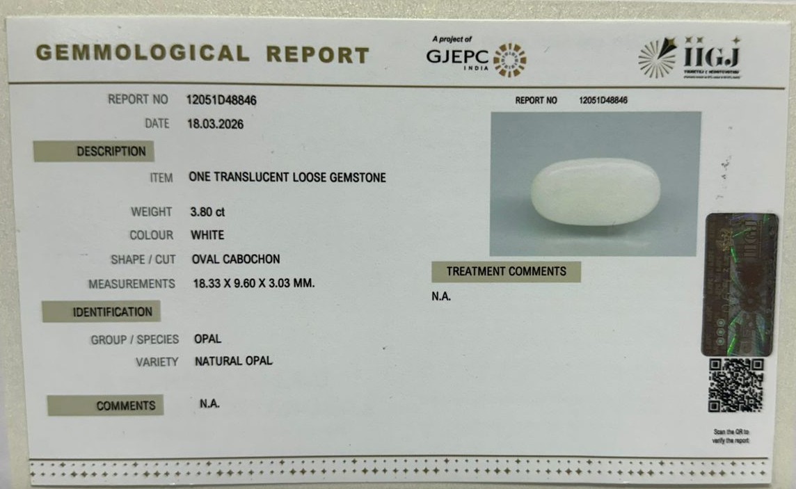 Beautiful 3.8 Cts Natural Opal (AAA+-Mines) sva 4+ Ratti OPAL. Free Horoscope & Free Pundit Ji Astrological Advise / Consultation. Original Natural Lab certified gems by IGI GTL / Birth stones / Large Gem Selection of shree shubh Rashi Ratan Vedic dhan at Gem Mines. May Bhagwan Brahma, Vishnu, Shiv & Universe bless you.