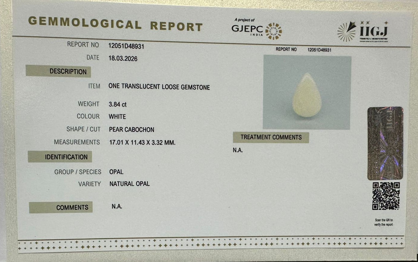 Beautiful 3.84 Cts Natural Opal (Top-Mines) sva 4+ Ratti OPAL. Free Horoscope & Free Pundit Ji Astrological Advise / Consultation. Original Natural Lab certified gems by IGI GTL / Birth stones / Large Gem Selection of shree shubh Rashi Ratan Vedic dhan at Gem Mines. May Bhagwan Brahma, Vishnu, Shiv & Universe bless you.