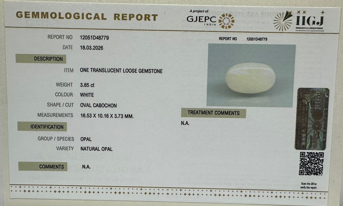 Beautiful 3.85 Cts Natural Opal (AAA+-Mines) sva 4+ Ratti OPAL. Free Horoscope & Free Pundit Ji Astrological Advise / Consultation. Original Natural Lab certified gems by IGI GTL / Birth stones / Large Gem Selection of shree shubh Rashi Ratan Vedic dhan at Gem Mines. May Bhagwan Brahma, Vishnu, Shiv & Universe bless you.