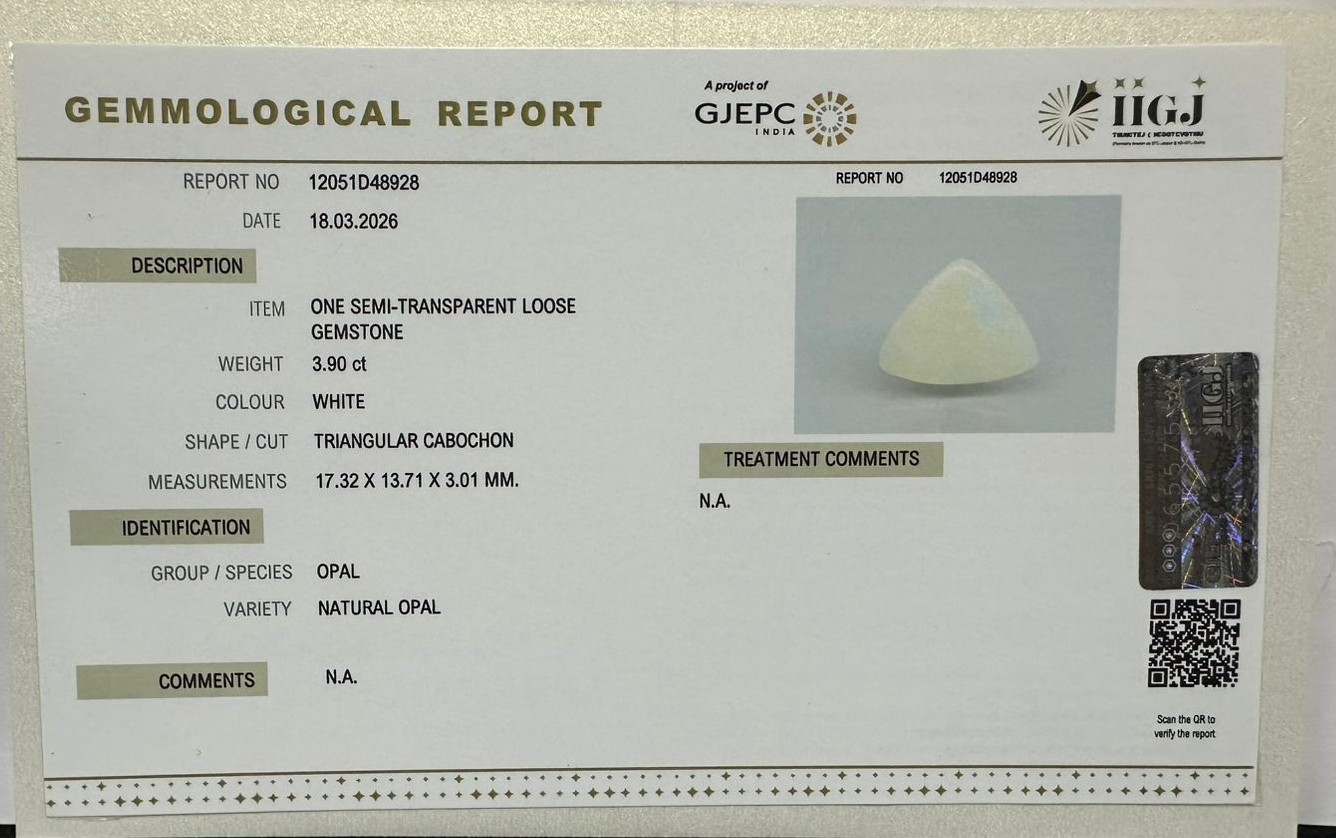 Beautiful 3.9 Cts Natural Opal (Very Good-Mines) sva 4+ Ratti OPAL. Free Horoscope & Free Pundit Ji Astrological Advise / Consultation. Original Natural Lab certified gems by IGI GTL / Birth stones / Large Gem Selection of shree shubh Rashi Ratan Vedic dhan at Gem Mines. May Bhagwan Brahma, Vishnu, Shiv & Universe bless you.