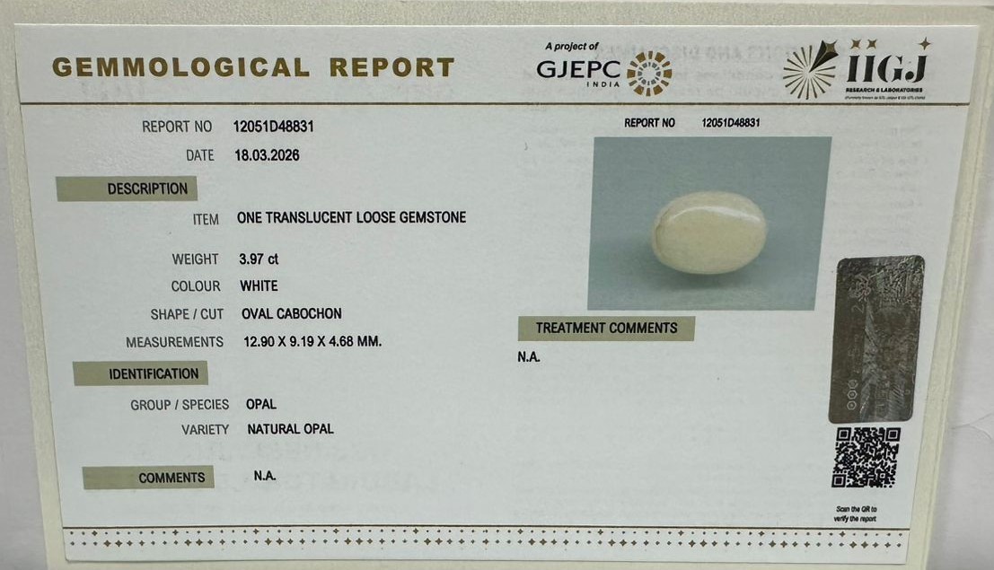 Beautiful 3.97 Cts Natural Opal (Very Good-Mines) sva 4+ Ratti OPAL. Free Horoscope & Free Pundit Ji Astrological Advise / Consultation. Original Natural Lab certified gems by IGI GTL / Birth stones / Large Gem Selection of shree shubh Rashi Ratan Vedic dhan at Gem Mines. May Bhagwan Brahma, Vishnu, Shiv & Universe bless you.