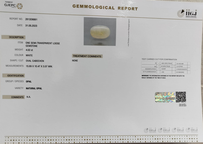 Beautiful 4.02 Ct. Natural Opal (Top++-Mines) sva 4+ Ratti Dudhiya Pathar. Free Horoscope & Free Pundit Ji Astrological Advise / Consultation. Original Natural Lab certified gems by IGI GTL / Birth stones / Large Gem Selection of shree shubh Rashi Ratan Vedic dhan at Gem Mines. May Bhagwan Brahma, Vishnu, Shiv & Universe bless you.