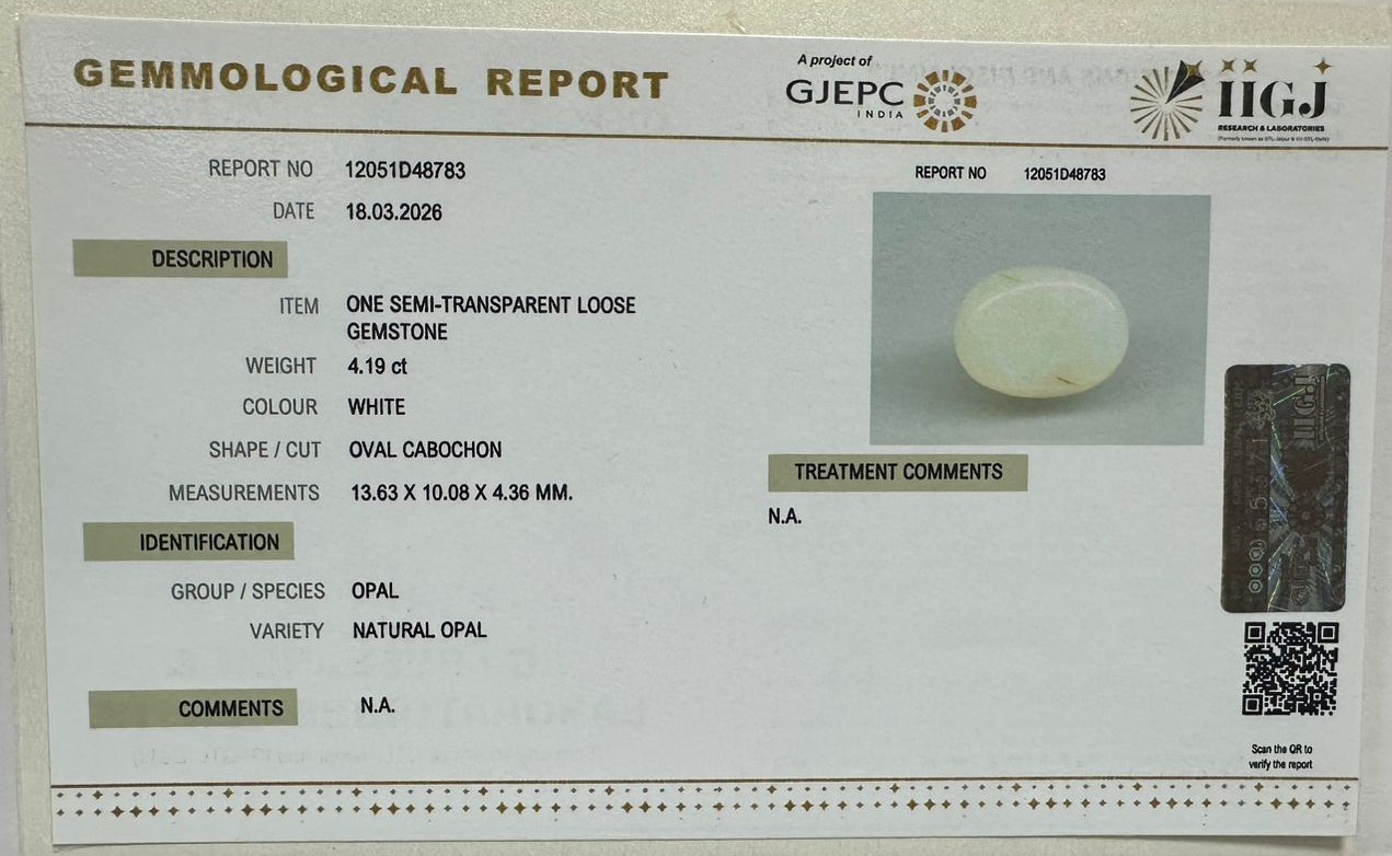 Beautiful 4.19 Cts Natural Opal (AAA+-Mines) sva 4+ Ratti OPAL. Free Horoscope & Free Pundit Ji Astrological Advise / Consultation. Original Natural Lab certified gems by IGI GTL / Birth stones / Large Gem Selection of shree shubh Rashi Ratan Vedic dhan at Gem Mines. May Bhagwan Brahma, Vishnu, Shiv & Universe bless you.
