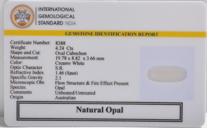 Beautiful 4.24 Cts Natural Opal (AAA+-Mines) sva 4+ Ratti OPAL. Free Horoscope & Free Pundit Ji Astrological Advise / Consultation. Original Natural Lab certified gems by IGI GTL / Birth stones / Large Gem Selection of shree shubh Rashi Ratan Vedic dhan at Gem Mines. May Bhagwan Brahma, Vishnu, Shiv & Universe bless you.