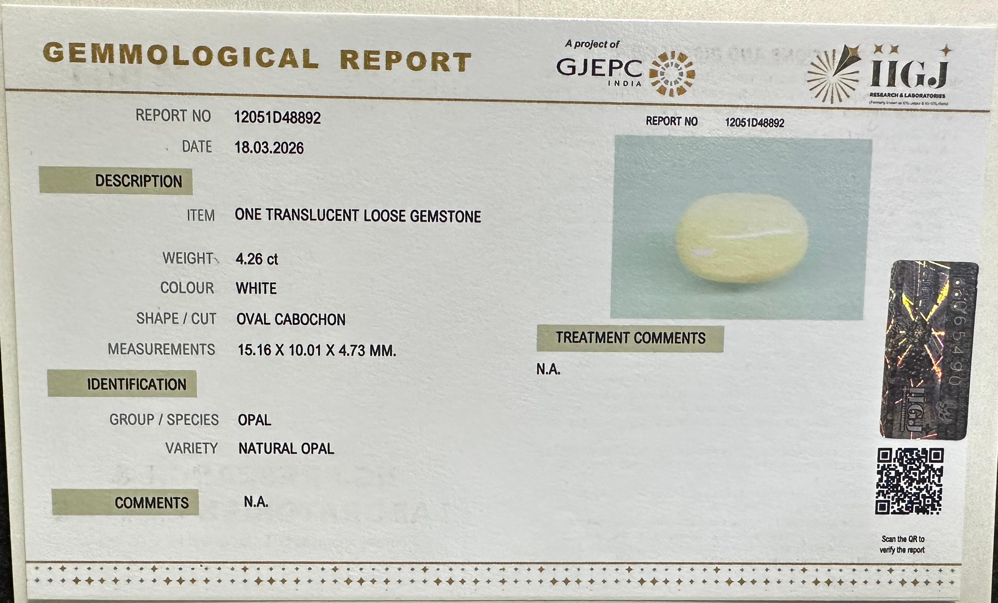 Beautiful 4.26 Cts Natural Opal (Very Good-Mines) sva 4+ Ratti OPAL. Free Horoscope & Free Pundit Ji Astrological Advise / Consultation. Original Natural Lab certified gems by IGI GTL / Birth stones / Large Gem Selection of shree shubh Rashi Ratan Vedic dhan at Gem Mines. May Bhagwan Brahma, Vishnu, Shiv & Universe bless you.