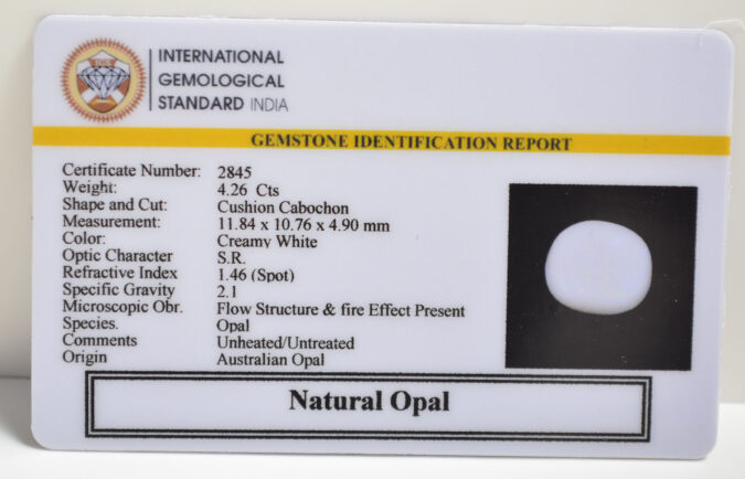 Beautiful 4.26 Cts Natural Opal (Top-Mines) sva 4+ Ratti OPAL. Free Horoscope & Free Pundit Ji Astrological Advise / Consultation. Original Natural Lab certified gems by IGI GTL / Birth stones / Large Gem Selection of shree shubh Rashi Ratan Vedic dhan at Gem Mines. May Bhagwan Brahma, Vishnu, Shiv & Universe bless you.