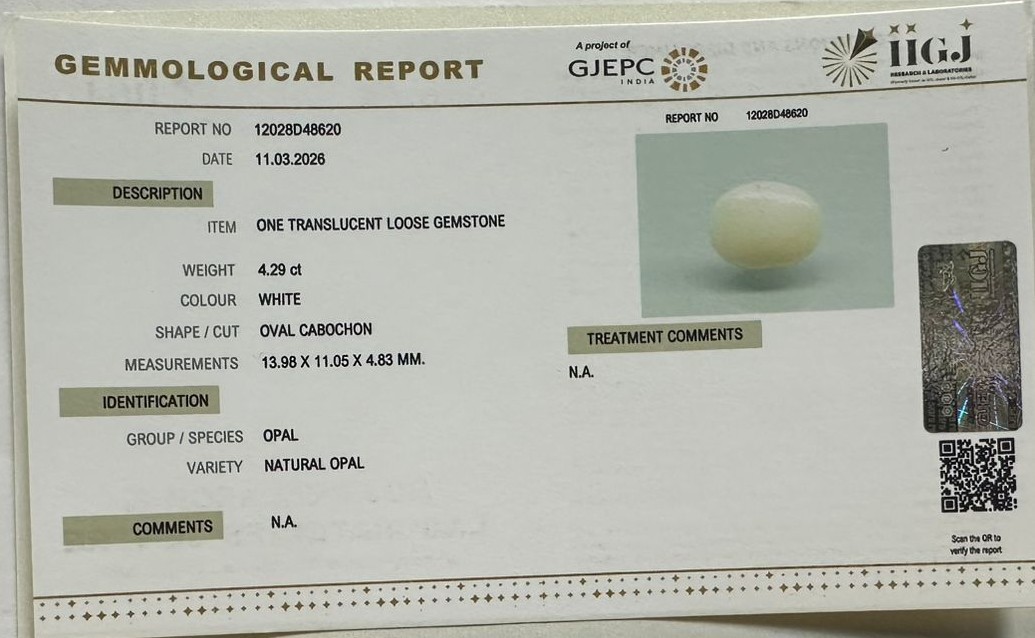 Beautiful 4.29 Cts Natural Opal (Top-Mines) sva 4+ Ratti OPAL. Free Horoscope & Free Pundit Ji Astrological Advise / Consultation. Original Natural Lab certified gems by IGI GTL / Birth stones / Large Gem Selection of shree shubh Rashi Ratan Vedic dhan at Gem Mines. May Bhagwan Brahma, Vishnu, Shiv & Universe bless you.