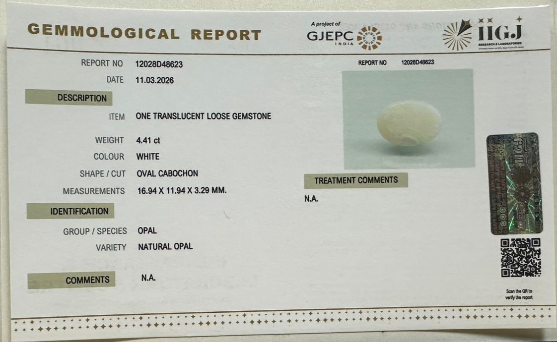 Beautiful 4.41 Cts Natural Opal (Top-Mines) sva 4+ Ratti OPAL. Free Horoscope & Free Pundit Ji Astrological Advise / Consultation. Original Natural Lab certified gems by IGI GTL / Birth stones / Large Gem Selection of shree shubh Rashi Ratan Vedic dhan at Gem Mines. May Bhagwan Brahma, Vishnu, Shiv & Universe bless you.