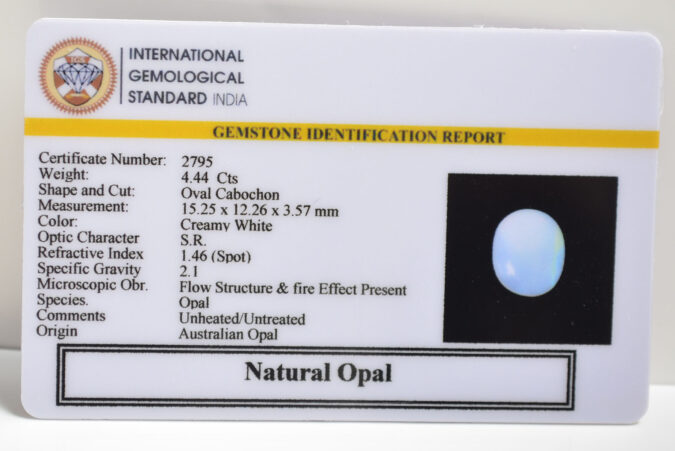 Beautiful 4.44 Cts Natural Opal (AAA+-Mines) sva 4+ Ratti OPAL. Free Horoscope & Free Pundit Ji Astrological Advise / Consultation. Original Natural Lab certified gems by IGI GTL / Birth stones / Large Gem Selection of shree shubh Rashi Ratan Vedic dhan at Gem Mines. May Bhagwan Brahma, Vishnu, Shiv & Universe bless you.