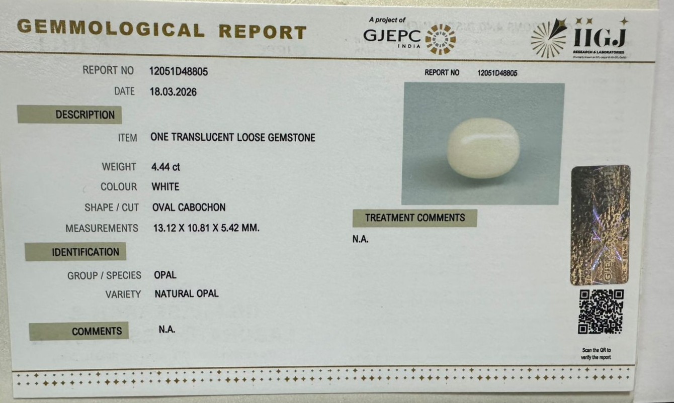 Beautiful 4.44 Cts Natural Opal (Very Good-Mines) sva 4+ Ratti OPAL. Free Horoscope & Free Pundit Ji Astrological Advise / Consultation. Original Natural Lab certified gems by IGI GTL / Birth stones / Large Gem Selection of shree shubh Rashi Ratan Vedic dhan at Gem Mines. May Bhagwan Brahma, Vishnu, Shiv & Universe bless you.