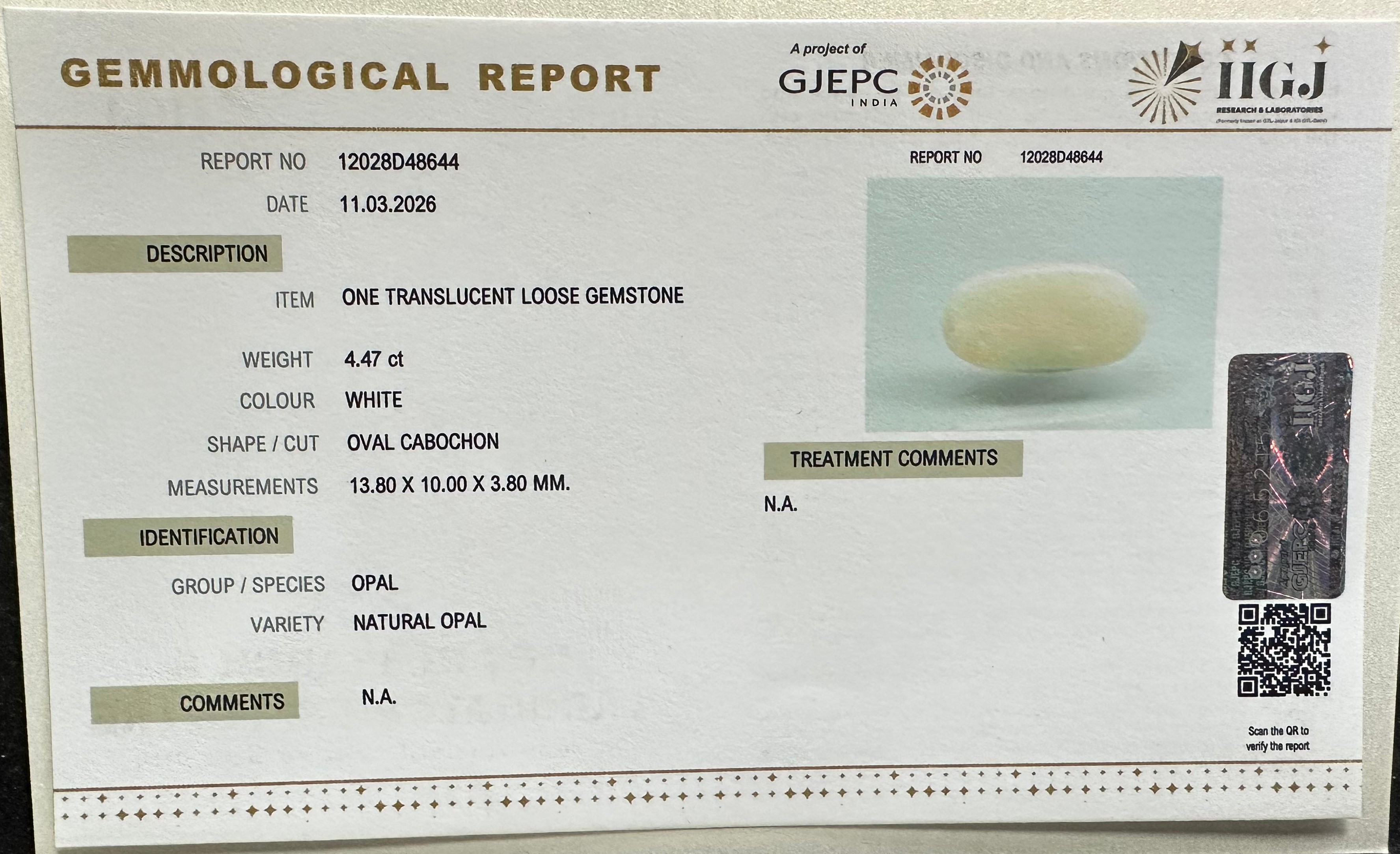 Beautiful 4.47 Cts Natural Opal (Top-Mines) sva 4+ Ratti OPAL. Free Horoscope & Free Pundit Ji Astrological Advise / Consultation. Original Natural Lab certified gems by IGI GTL / Birth stones / Large Gem Selection of shree shubh Rashi Ratan Vedic dhan at Gem Mines. May Bhagwan Brahma, Vishnu, Shiv & Universe bless you.