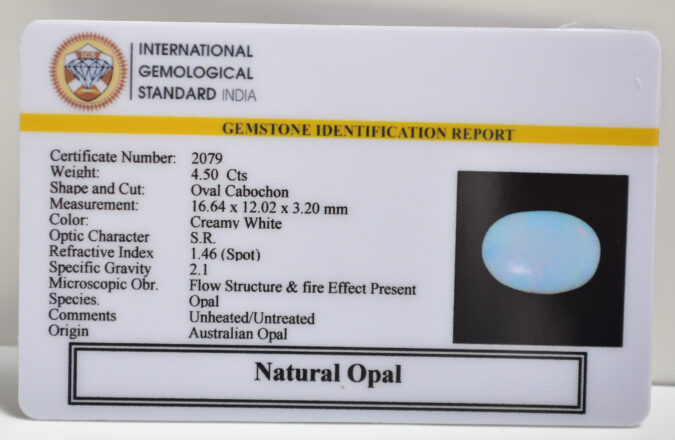 Beautiful 4.5 Cts Natural Opal (AAA+-Mines) sva 5+ Ratti OPAL. Free Horoscope & Free Pundit Ji Astrological Advise / Consultation. Original Natural Lab certified gems by IGI GTL / Birth stones / Large Gem Selection of shree shubh Rashi Ratan Vedic dhan at Gem Mines. May Bhagwan Brahma, Vishnu, Shiv & Universe bless you.