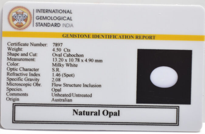 Beautiful 4.5 Cts Natural Opal (AAA+-Mines) sva 5+ Ratti OPAL. Free Horoscope & Free Pundit Ji Astrological Advise / Consultation. Original Natural Lab certified gems by IGI GTL / Birth stones / Large Gem Selection of shree shubh Rashi Ratan Vedic dhan at Gem Mines. May Bhagwan Brahma, Vishnu, Shiv & Universe bless you.