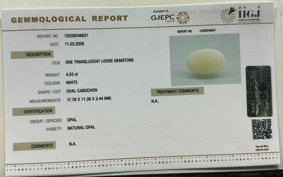 Beautiful 4.53 Cts Natural Opal (Top-Mines) sva 5+ Ratti OPAL. Free Horoscope & Free Pundit Ji Astrological Advise / Consultation. Original Natural Lab certified gems by IGI GTL / Birth stones / Large Gem Selection of shree shubh Rashi Ratan Vedic dhan at Gem Mines. May Bhagwan Brahma, Vishnu, Shiv & Universe bless you.