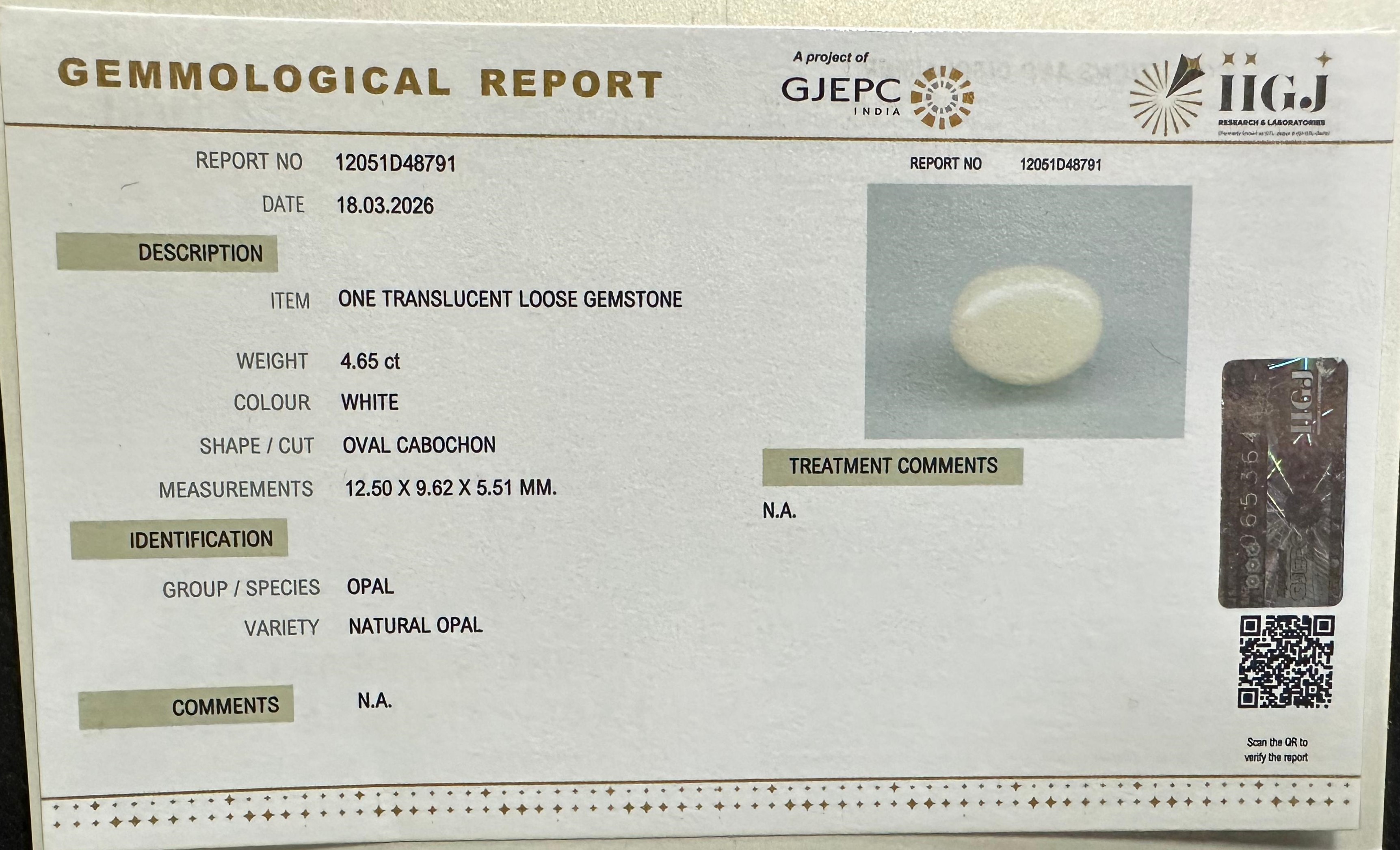 Beautiful 4.65 Cts Natural Opal (AAA+-Mines) sva 5+ Ratti OPAL. Free Horoscope & Free Pundit Ji Astrological Advise / Consultation. Original Natural Lab certified gems by IGI GTL / Birth stones / Large Gem Selection of shree shubh Rashi Ratan Vedic dhan at Gem Mines. May Bhagwan Brahma, Vishnu, Shiv & Universe bless you.