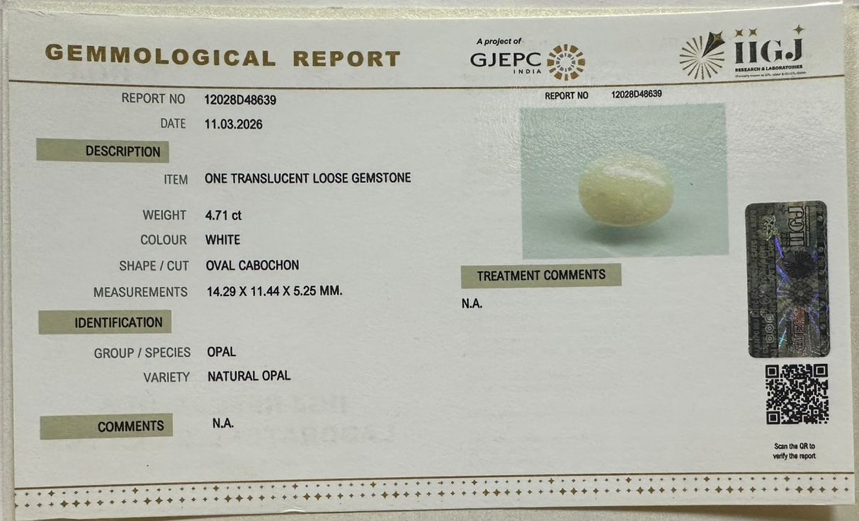Beautiful 4.71 Cts Natural Opal (Top-Mines) sva 5+ Ratti OPAL. Free Horoscope & Free Pundit Ji Astrological Advise / Consultation. Original Natural Lab certified gems by IGI GTL / Birth stones / Large Gem Selection of shree shubh Rashi Ratan Vedic dhan at Gem Mines. May Bhagwan Brahma, Vishnu, Shiv & Universe bless you.