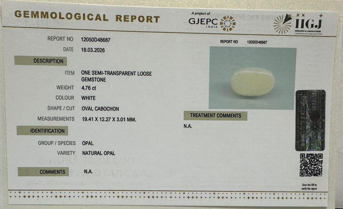 Beautiful 4.76 Cts Natural Opal (AAA-Mines) sva 5+ Ratti OPAL. Free Horoscope & Free Pundit Ji Astrological Advise / Consultation. Original Natural Lab certified gems by IGI GTL / Birth stones / Large Gem Selection of shree shubh Rashi Ratan Vedic dhan at Gem Mines. May Bhagwan Brahma, Vishnu, Shiv & Universe bless you.