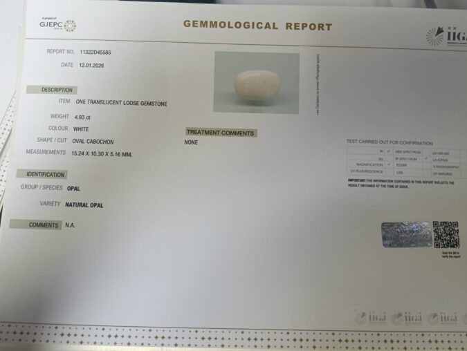 Beautiful 4.93 Cts Natural Opal (Top-Mines) sva 5+ Ratti OPAL. Free Horoscope & Free Pundit Ji Astrological Advise / Consultation. Original Natural Lab certified gems by IGI GTL / Birth stones / Large Gem Selection of shree shubh Rashi Ratan Vedic dhan at Gem Mines. May Bhagwan Brahma, Vishnu, Shiv & Universe bless you.