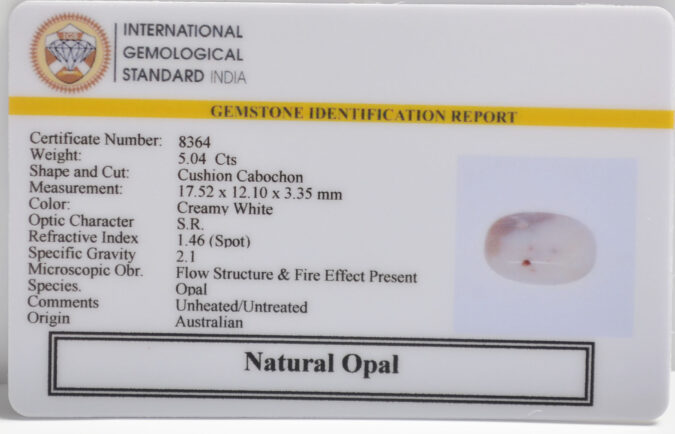 Beautiful 5.04 Cts Natural Opal (Good-Mines) sva 5+ Ratti OPAL. Free Horoscope & Free Pundit Ji Astrological Advise / Consultation. Original Natural Lab certified gems by IGI GTL / Birth stones / Large Gem Selection of shree shubh Rashi Ratan Vedic dhan at Gem Mines. May Bhagwan Brahma, Vishnu, Shiv & Universe bless you.