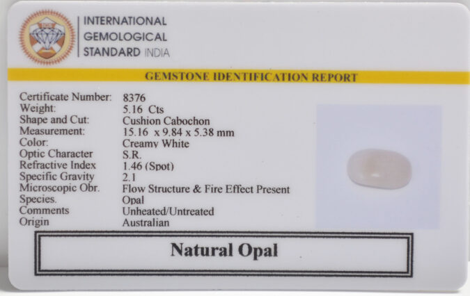 Beautiful 5.16 Cts Natural Opal (Good-Mines) sva 5+ Ratti OPAL. Free Horoscope & Free Pundit Ji Astrological Advise / Consultation. Original Natural Lab certified gems by IGI GTL / Birth stones / Large Gem Selection of shree shubh Rashi Ratan Vedic dhan at Gem Mines. May Bhagwan Brahma, Vishnu, Shiv & Universe bless you.