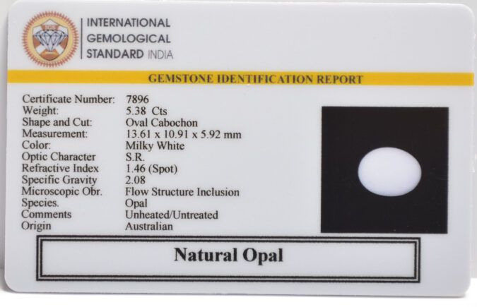 Beautiful 5.38 Cts Natural Opal (AAA+-Mines) sva 5+ Ratti OPAL. Free Horoscope & Free Pundit Ji Astrological Advise / Consultation. Original Natural Lab certified gems by IGI GTL / Birth stones / Large Gem Selection of shree shubh Rashi Ratan Vedic dhan at Gem Mines. May Bhagwan Brahma, Vishnu, Shiv & Universe bless you.