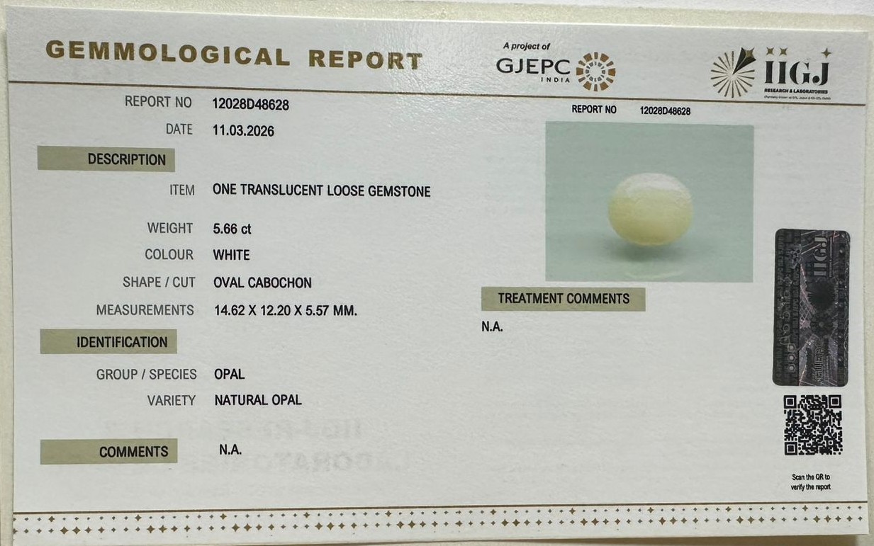 Beautiful 5.66 Cts Natural Opal (AAA+-Mines) sva 6+ Ratti OPAL. Free Horoscope & Free Pundit Ji Astrological Advise / Consultation. Original Natural Lab certified gems by IGI GTL / Birth stones / Large Gem Selection of shree shubh Rashi Ratan Vedic dhan at Gem Mines. May Bhagwan Brahma, Vishnu, Shiv & Universe bless you.