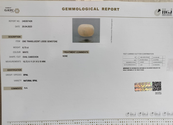 Beautiful 6.73 Ct. Natural Opal (Top++-Mines) sva 7+ Ratti Dudhiya Pathar. Free Horoscope & Free Pundit Ji Astrological Advise / Consultation. Original Natural Lab certified gems by IGI GTL / Birth stones / Large Gem Selection of shree shubh Rashi Ratan Vedic dhan at Gem Mines. May Bhagwan Brahma, Vishnu, Shiv & Universe bless you.