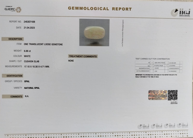 Beautiful 6.88 Ct. Natural Opal (Top++-Mines) sva 7+ Ratti Dudhiya Pathar. Free Horoscope & Free Pundit Ji Astrological Advise / Consultation. Original Natural Lab certified gems by IGI GTL / Birth stones / Large Gem Selection of shree shubh Rashi Ratan Vedic dhan at Gem Mines. May Bhagwan Brahma, Vishnu, Shiv & Universe bless you.