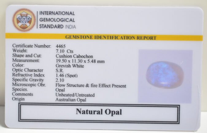 Beautiful 7.1 Cts Natural Opal (AAA+-Mines) sva 7+ Ratti OPAL. Free Horoscope & Free Pundit Ji Astrological Advise / Consultation. Original Natural Lab certified gems by IGI GTL / Birth stones / Large Gem Selection of shree shubh Rashi Ratan Vedic dhan at Gem Mines. May Bhagwan Brahma, Vishnu, Shiv & Universe bless you.