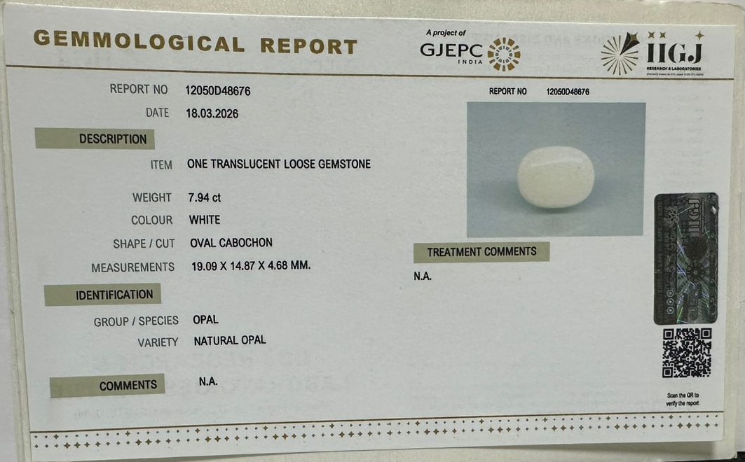 Beautiful 7.94 Cts Natural Opal (AAA-Mines) sva 8+ Ratti OPAL. Free Horoscope & Free Pundit Ji Astrological Advise / Consultation. Original Natural Lab certified gems by IGI GTL / Birth stones / Large Gem Selection of shree shubh Rashi Ratan Vedic dhan at Gem Mines. May Bhagwan Brahma, Vishnu, Shiv & Universe bless you.